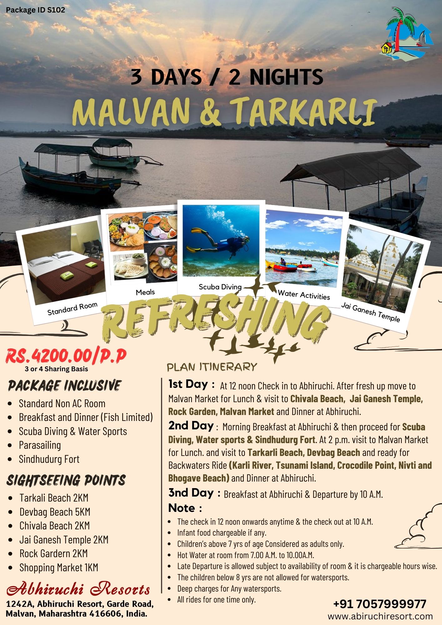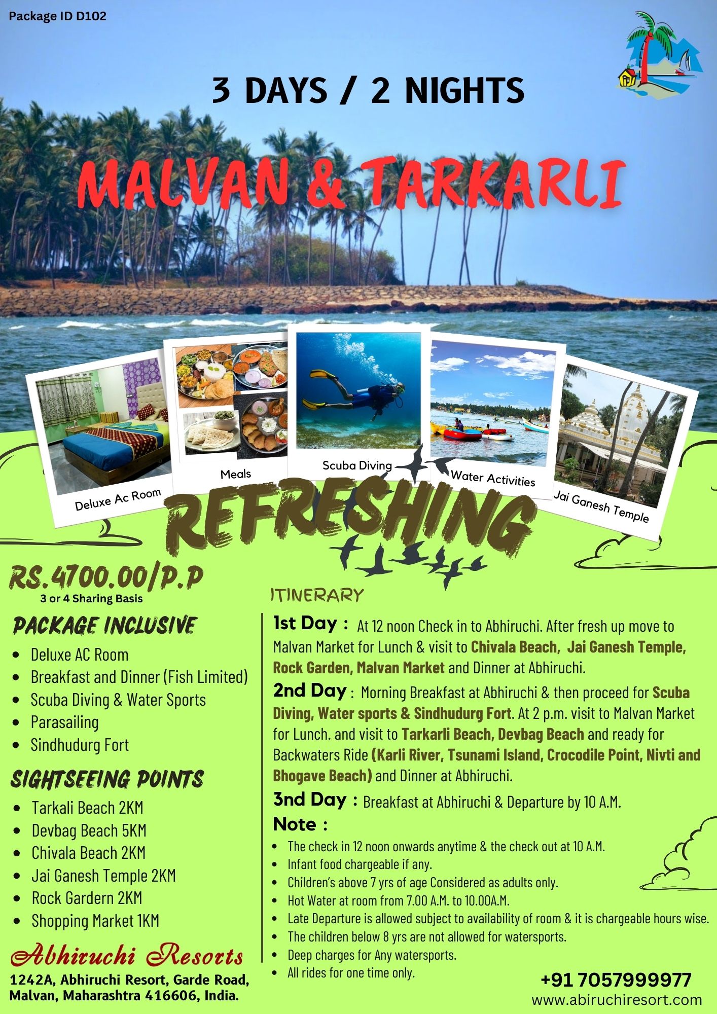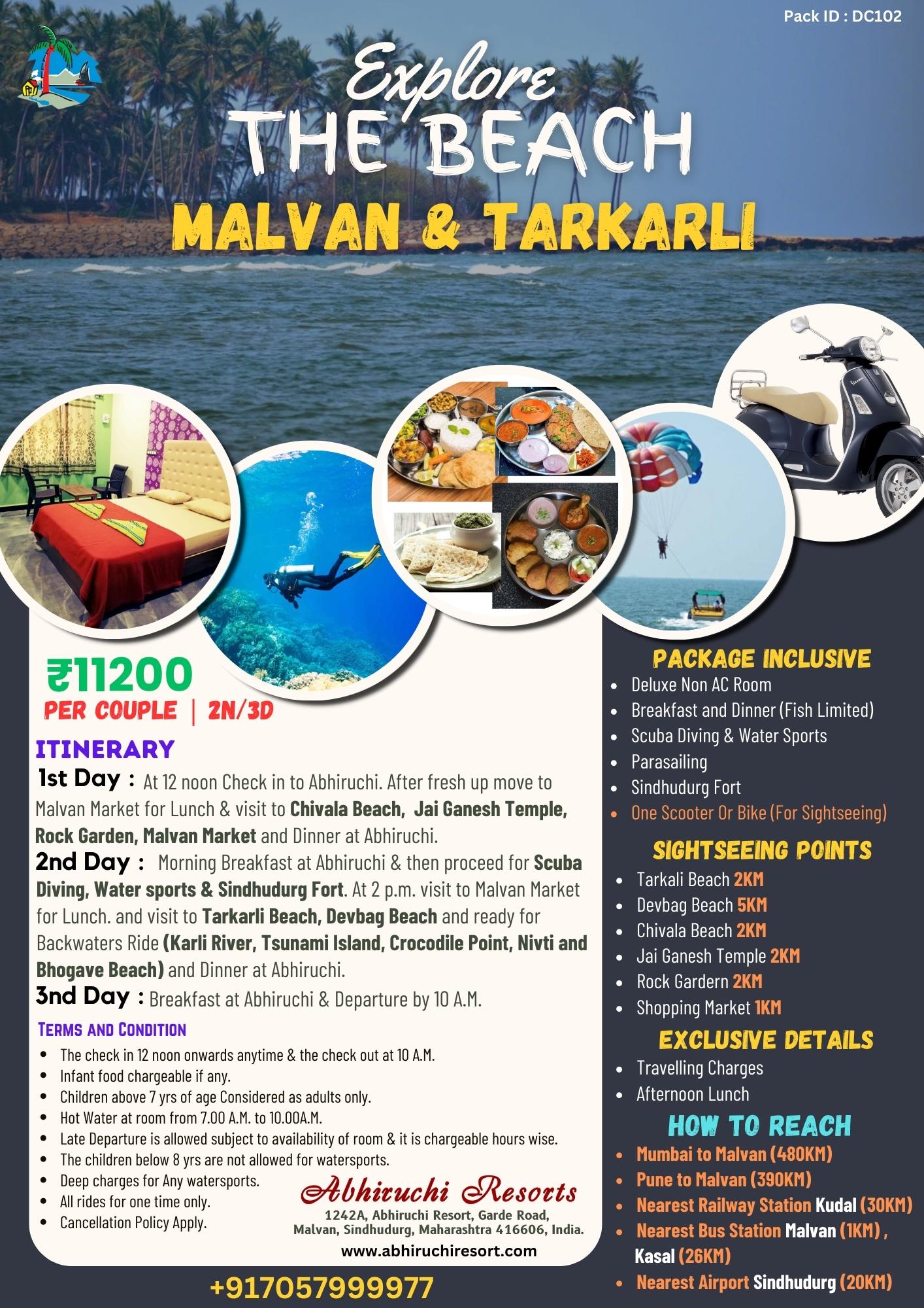 Abhiruchi Resorts is about 520 kms away from Mumbai on the coast of Maharashtra in Malvan. Where everything is done to offer guests the tranquil, serene setting expectations. A restful, elegant atmosphere, a decor in warm, soothing tones, quality furnishings with all modern convenience to get that delightful feeling of being pampered.With the tradition of providing perfect services, outstanding cuisine and comfortable rooms, you will find Abhiruchi Resorts to be fully alive and with a guiding philosophy of warm hospitality.A modest tariff for the facilities offered is genuine