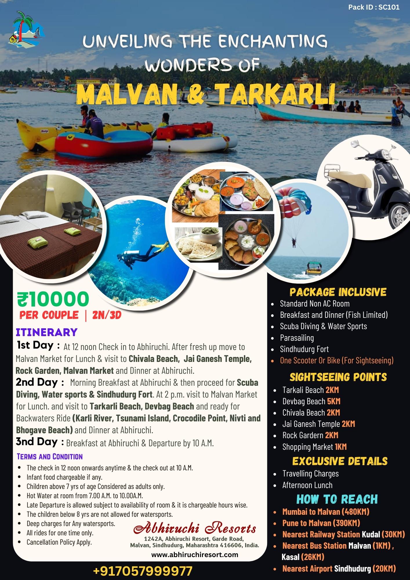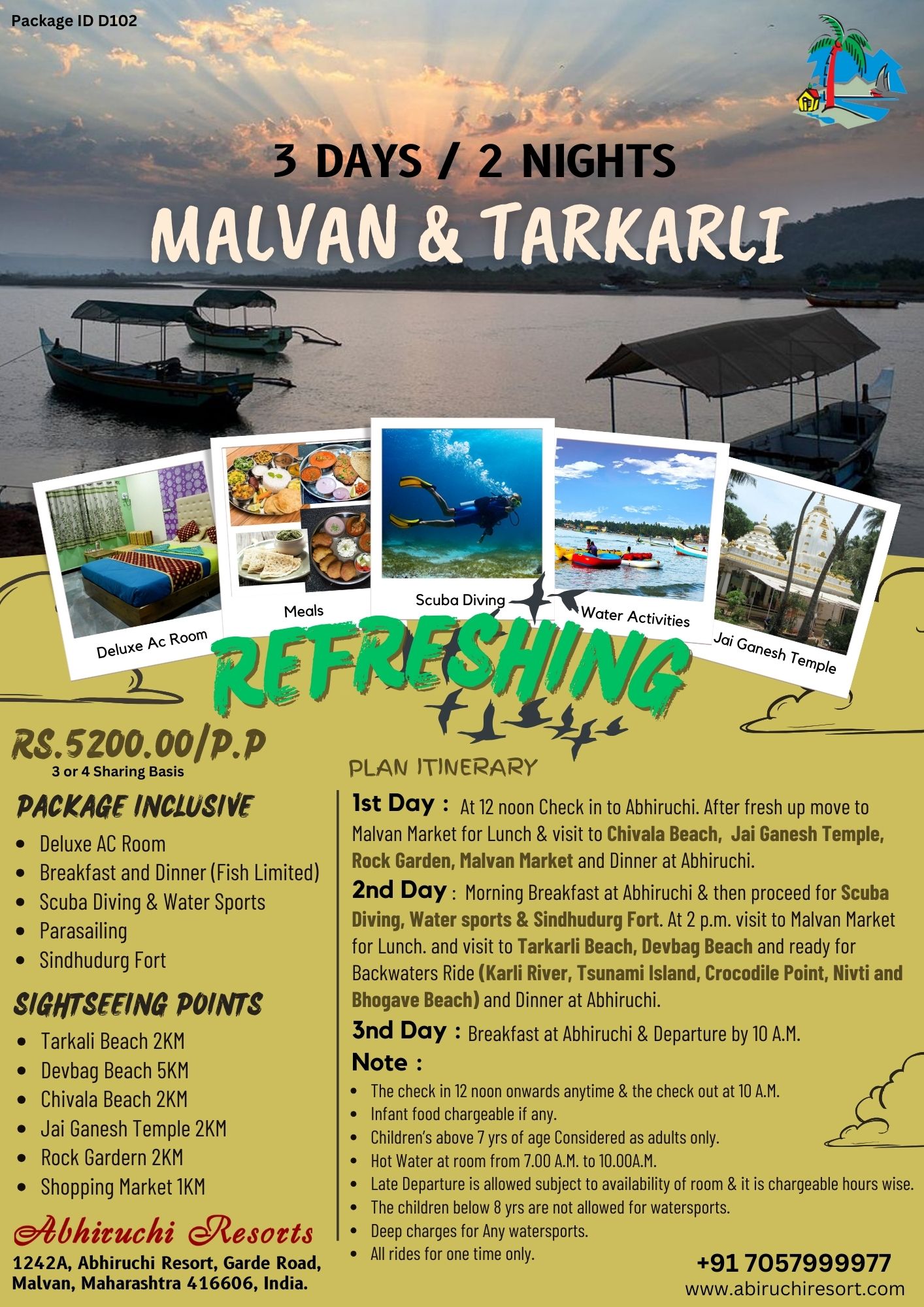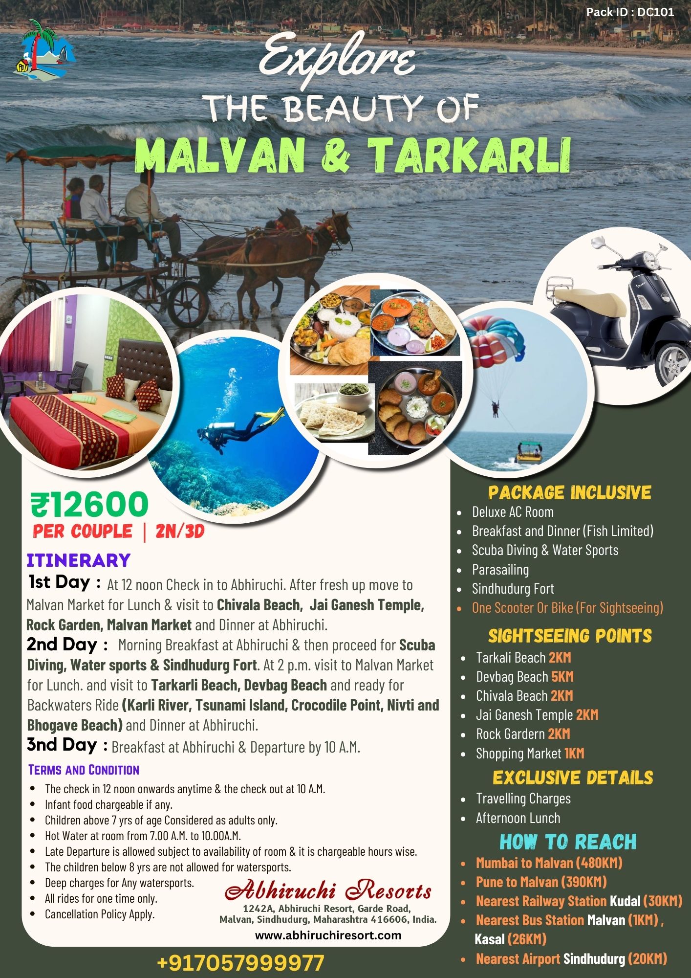 Abhiruchi Resorts is about 520 kms away from Mumbai on the coast of Maharashtra in Malvan. Where everything is done to offer guests the tranquil, serene setting expectations. A restful, elegant atmosphere, a decor in warm, soothing tones, quality furnishings with all modern convenience to get that delightful feeling of being pampered.With the tradition of providing perfect services, outstanding cuisine and comfortable rooms, you will find Abhiruchi Resorts to be fully alive and with a guiding philosophy of warm hospitality.A modest tariff for the facilities offered is genuine